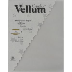 CLEAR VELLUM 8.5x11 12PK 24#. GRAFIX®, Translucent and Deluxe VellumThese translucent colored papers come in varying weights and can be used for all types of paper crafts including stamping, embossing, punching, crimping, folding, painting, die-cutting, and laser printing. No scrapbook project is complete without using vellum to enhance a photo or quote. A must for card and invitation making and also great for overlays or imprintables. Even use for home decor items like luminaries, gift boxes, or lamp shades. 24 lb. 8½,", x 11",. 12-sheet packs.