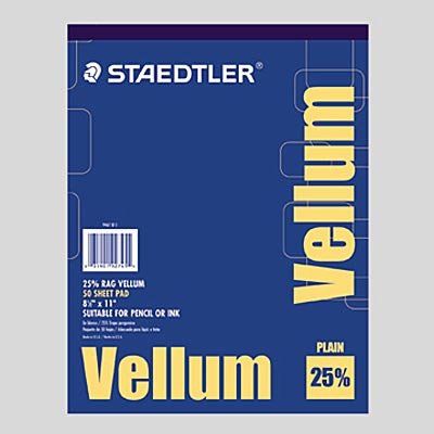 Staedtler Vellum Paper Pad offers 50 sheets of plain smooth surfaced paper that allows the use of pens, colored pencils and regular pencils for rendering quality artwork. Paper is transparent with a frosted quality, so you can see through it to use a ready made design that you wish to draw, paint or color. Vellum paper is ideal for projects in schools and businesses. Erases clean with no smudges or ghosting. Contains 25 percent rag. -Product Type: Multipurpose Paper. -Recycled: No. -Recycled Content: 0%. -Post-consumer-waste%: 0%. -Assembly Required: No. -Color: White. -Brand Name: Staedtler. -Manufacturer: Staedtler Mars GmbH & Co.. -Media Weight: 16 lb. -Product Name: Vellum Paper Pad. -Finishing: Smooth. -Manufacturer Part Number: 946T 811. -Manufacturer Website Address: www.staedtler.com. -Media Size: Letter 8.50" x 11". -Packaged Quantity: 50 / Pad. -Weight (Approximate): 8 oz. STD946T811PAD;VELLUM;8.5X11;WE;25%RAG Feature